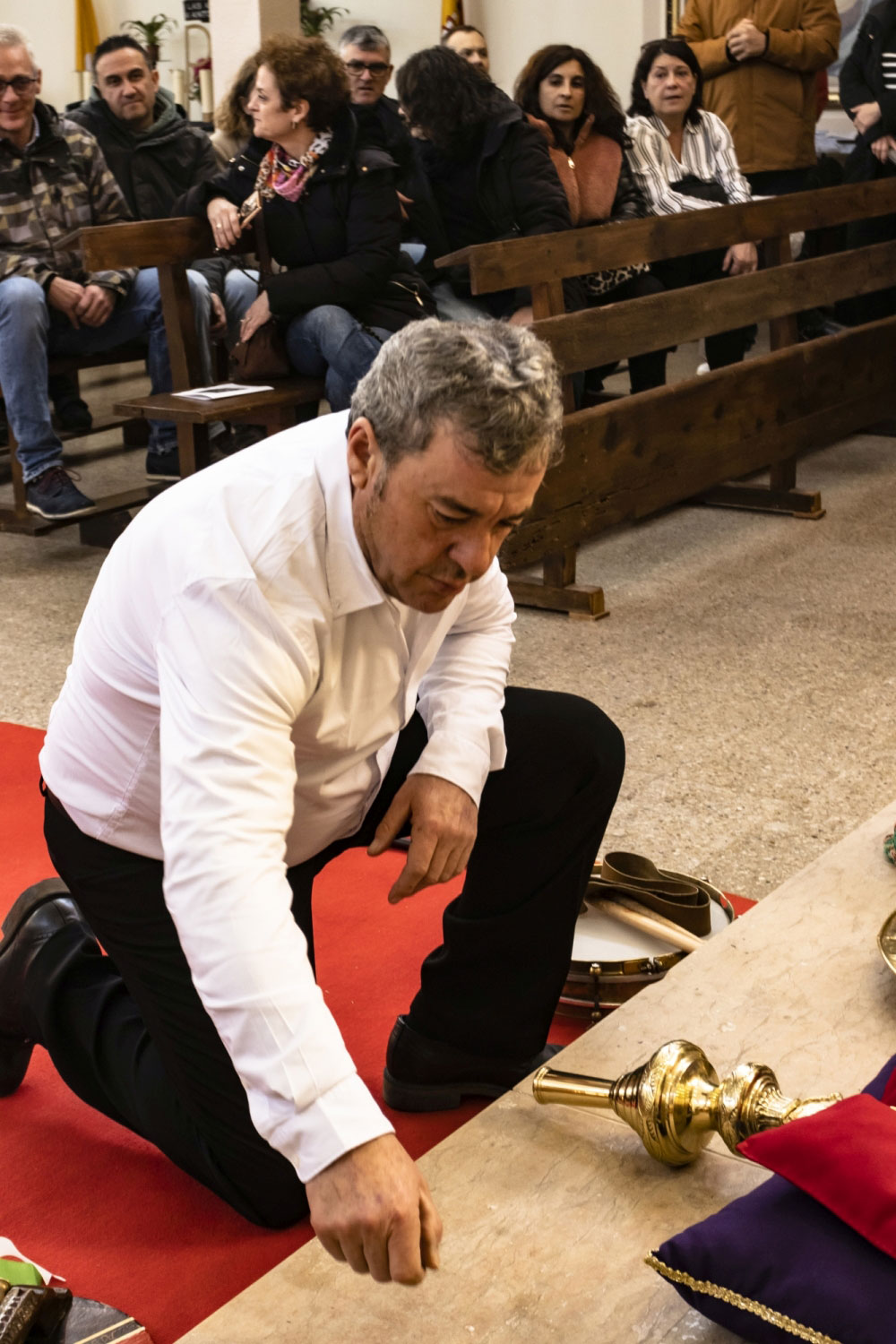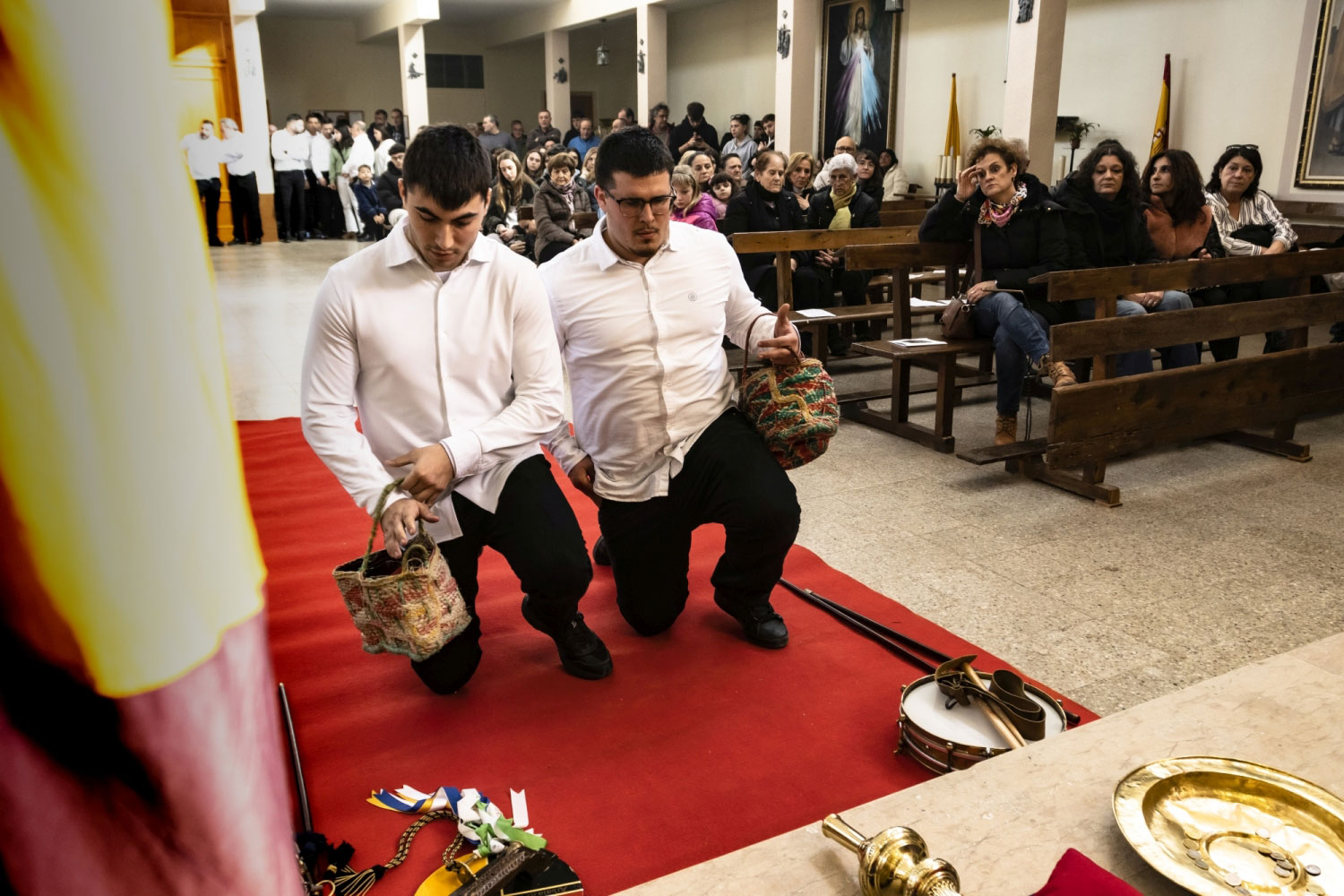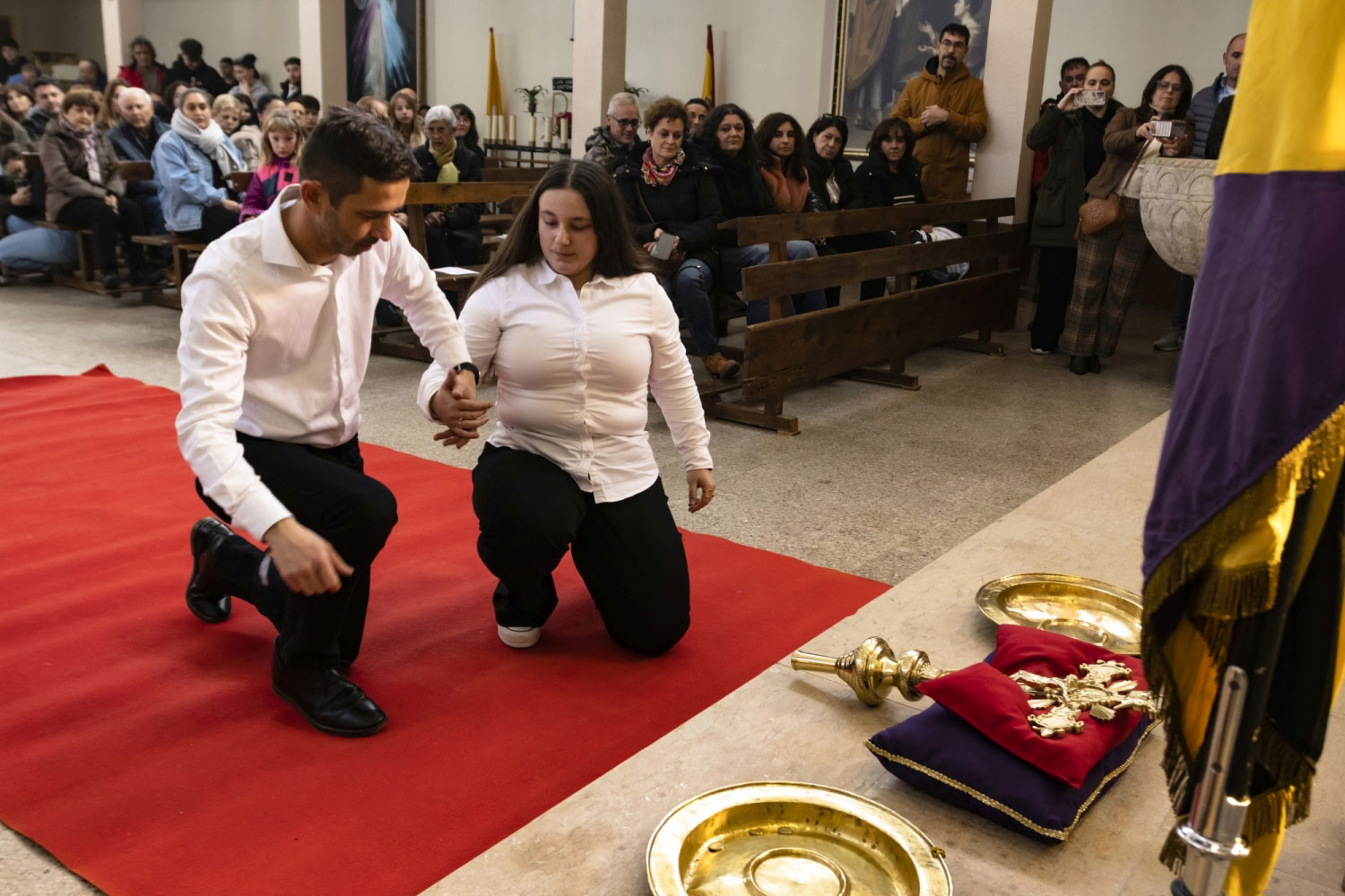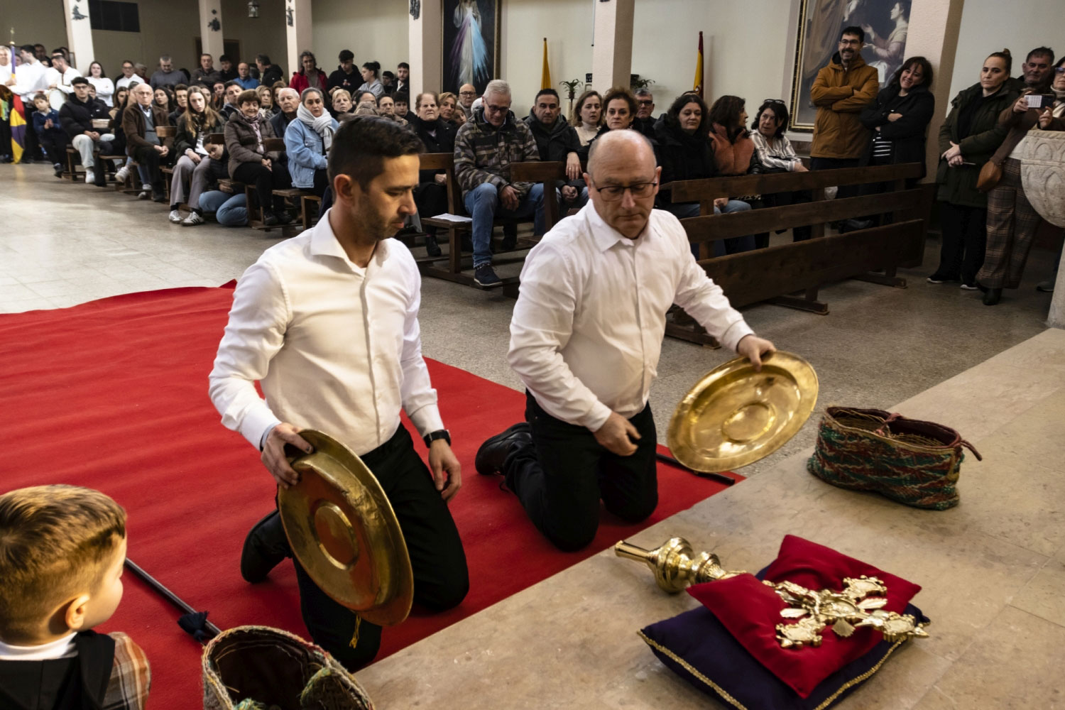 En silencio, cogidos de las manos por parejas, uno de cada grupo, se van acercando delante del altar con tres genuflexiones. Allí, besan la Cruz, dejan sus distintivos y ponen en las ‘vacías’ monedas de limosna para las Animas. Y Vuelven a su sitio entre tres nuevos arrodillamientos, de frente al altar.
