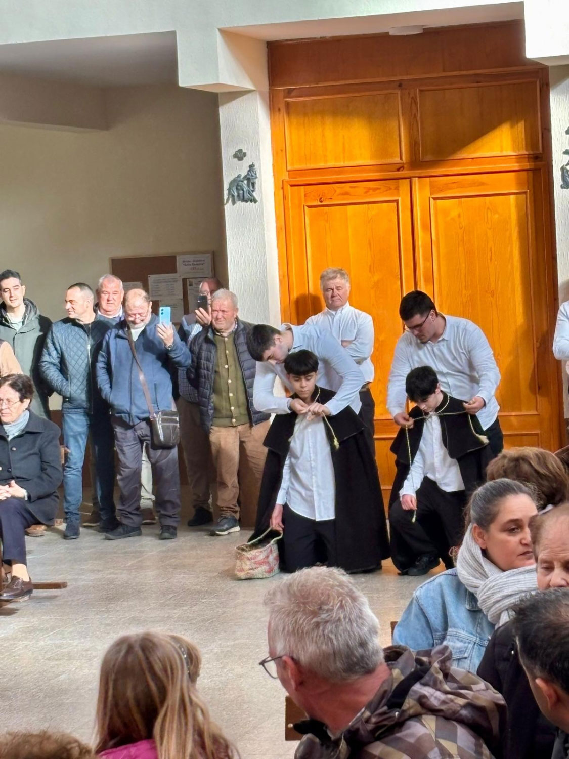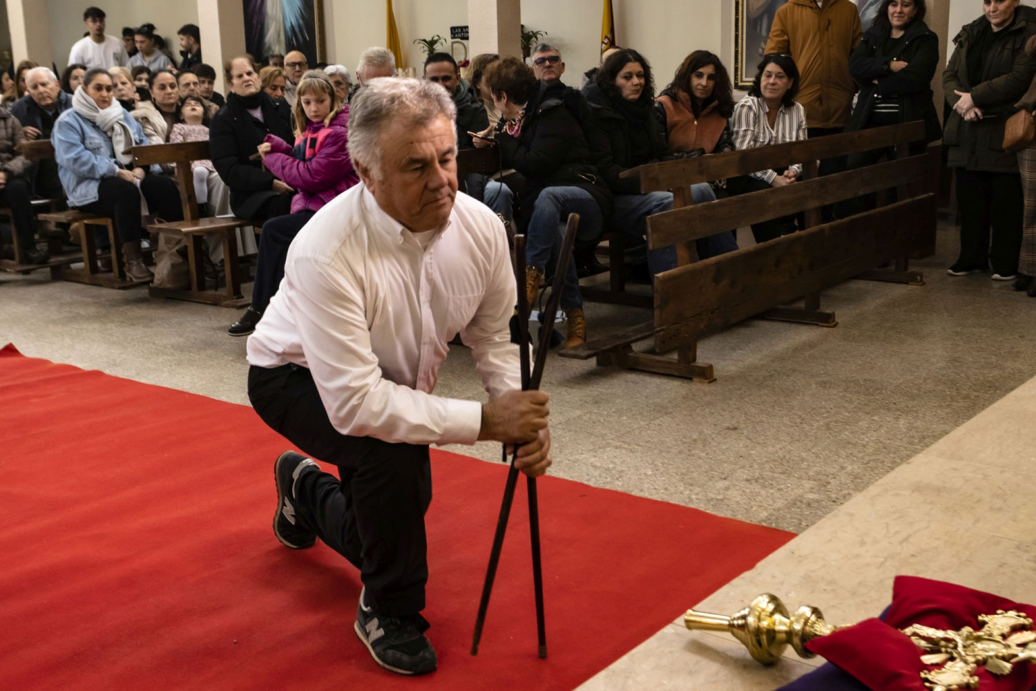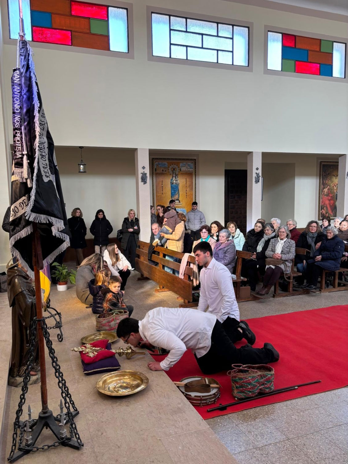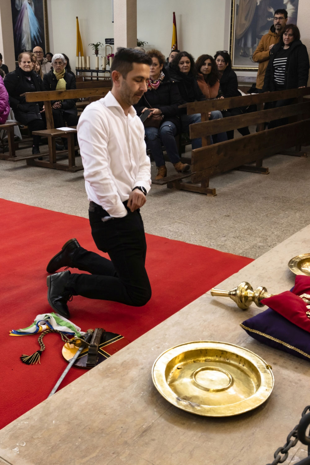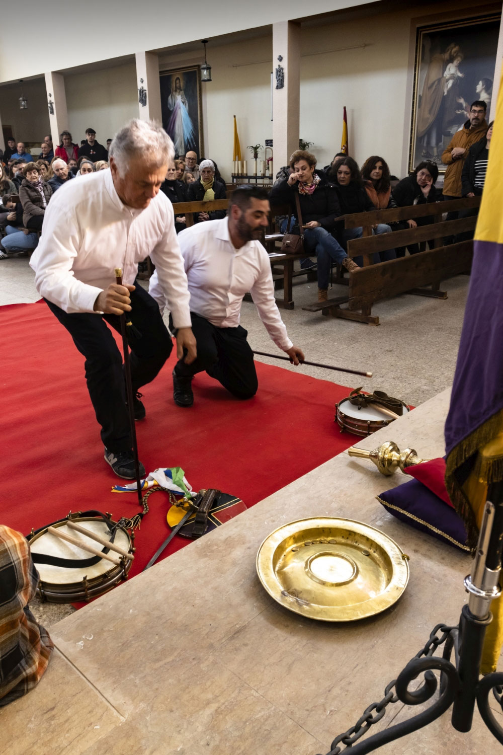 En silencio, cogidos de las manos por parejas, uno de cada grupo, se van acercando delante del altar con tres genuflexiones. Allí, besan la Cruz, dejan sus distintivos y ponen en las ‘vacías’ monedas de limosna para las Animas. Y Vuelven a su sitio entre tres nuevos arrodillamientos, de frente al altar.