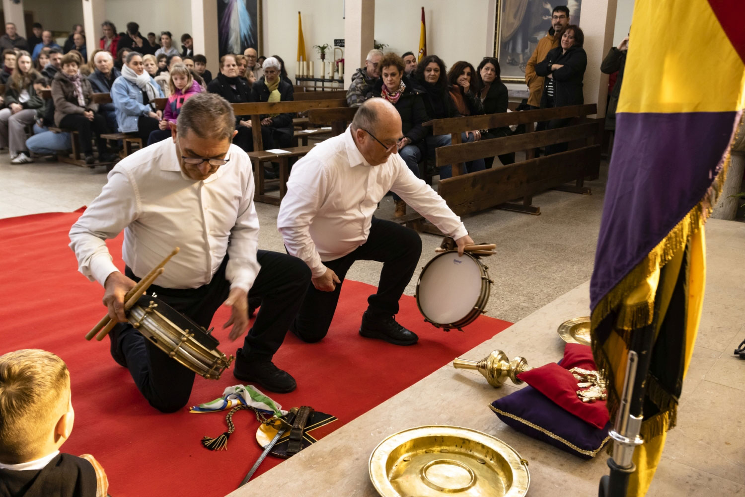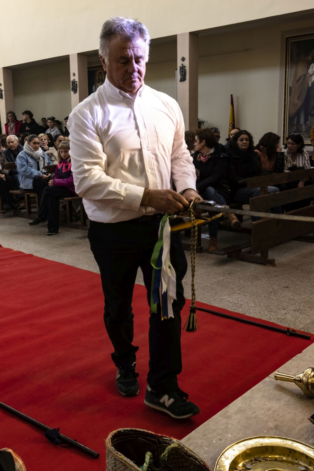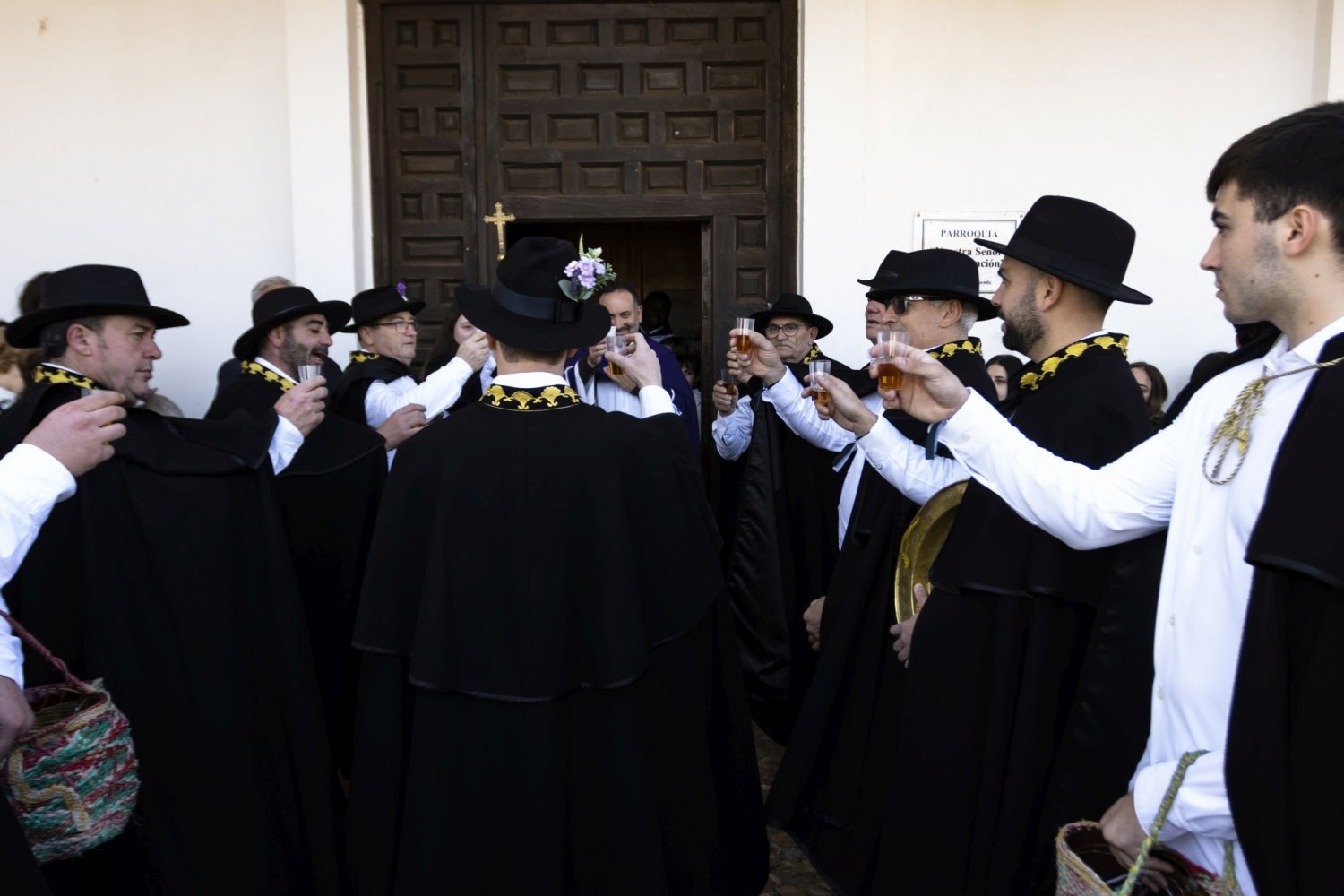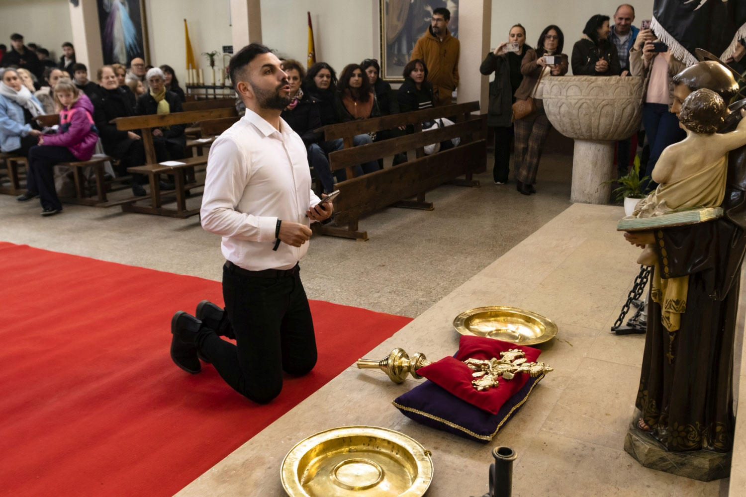 En silencio, cogidos de las manos por parejas, uno de cada grupo, se van acercando delante del altar con tres genuflexiones. Allí, besan la Cruz, dejan sus distintivos y ponen en las ‘vacías’ monedas de limosna para las Animas. Y Vuelven a su sitio entre tres nuevos arrodillamientos, de frente al altar.