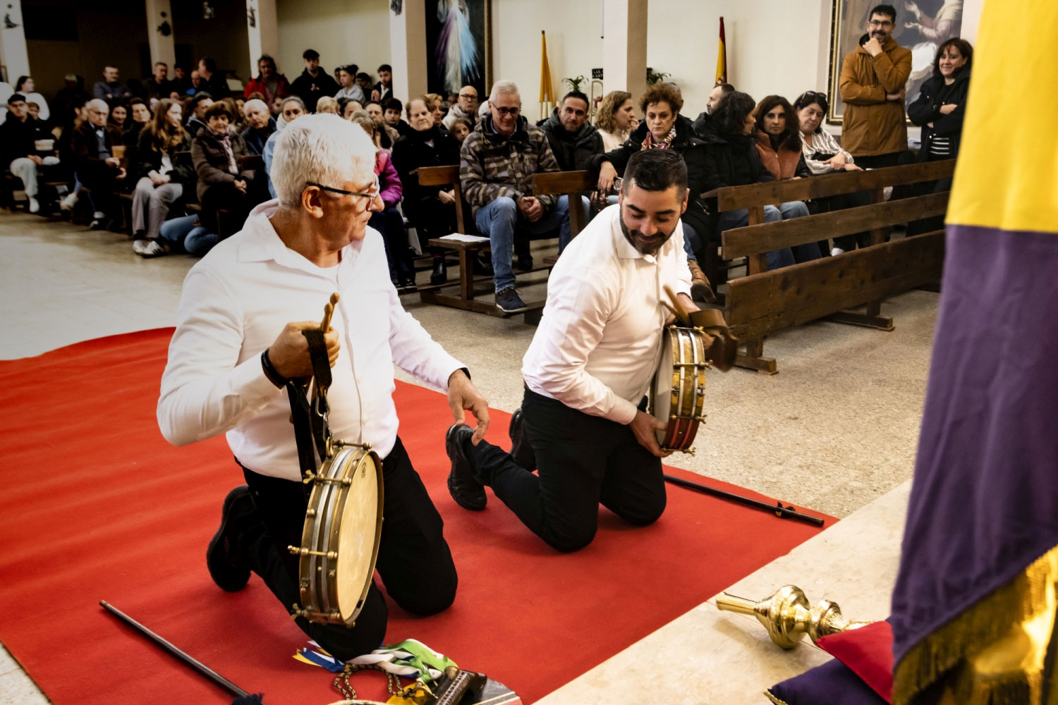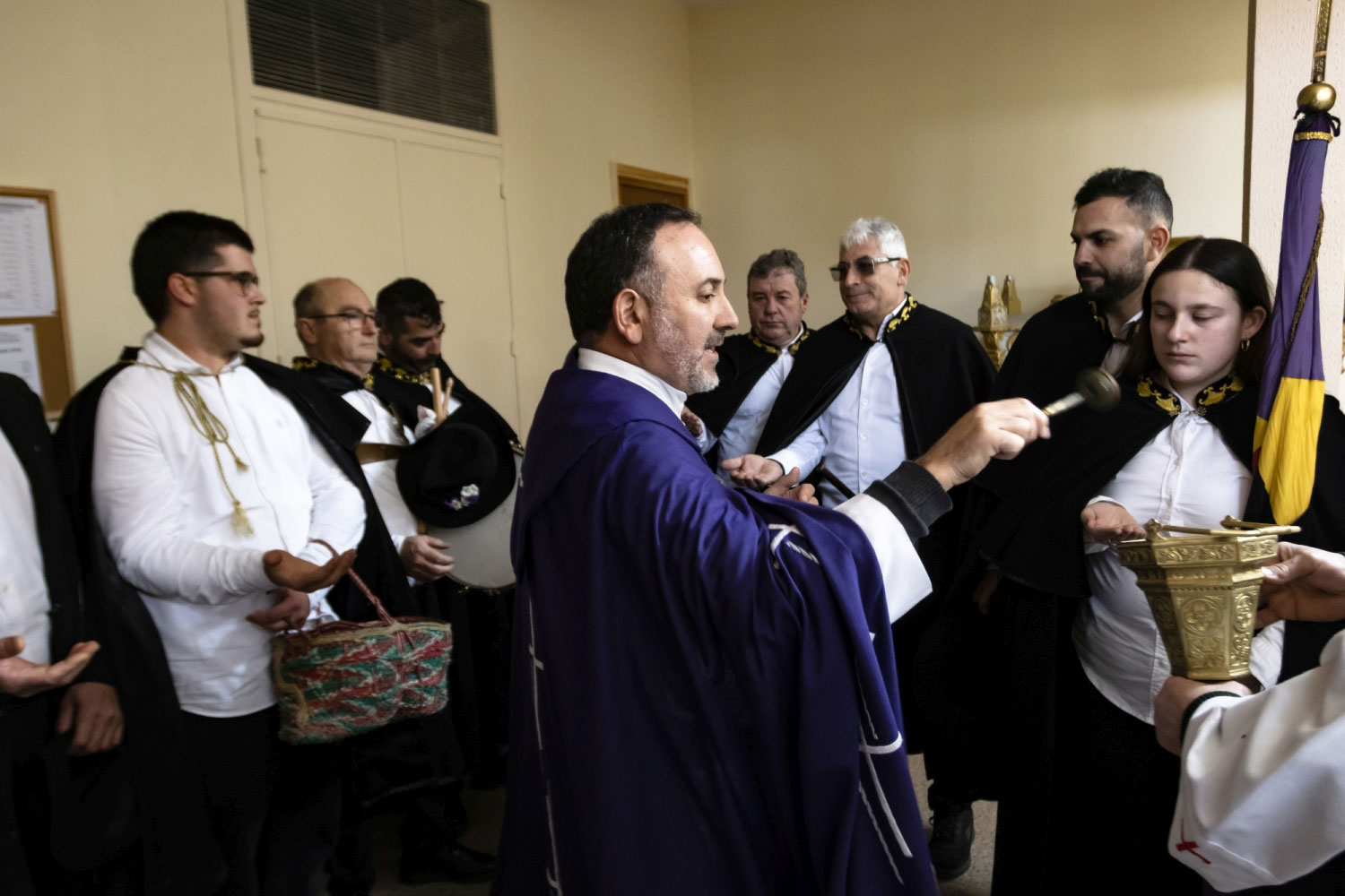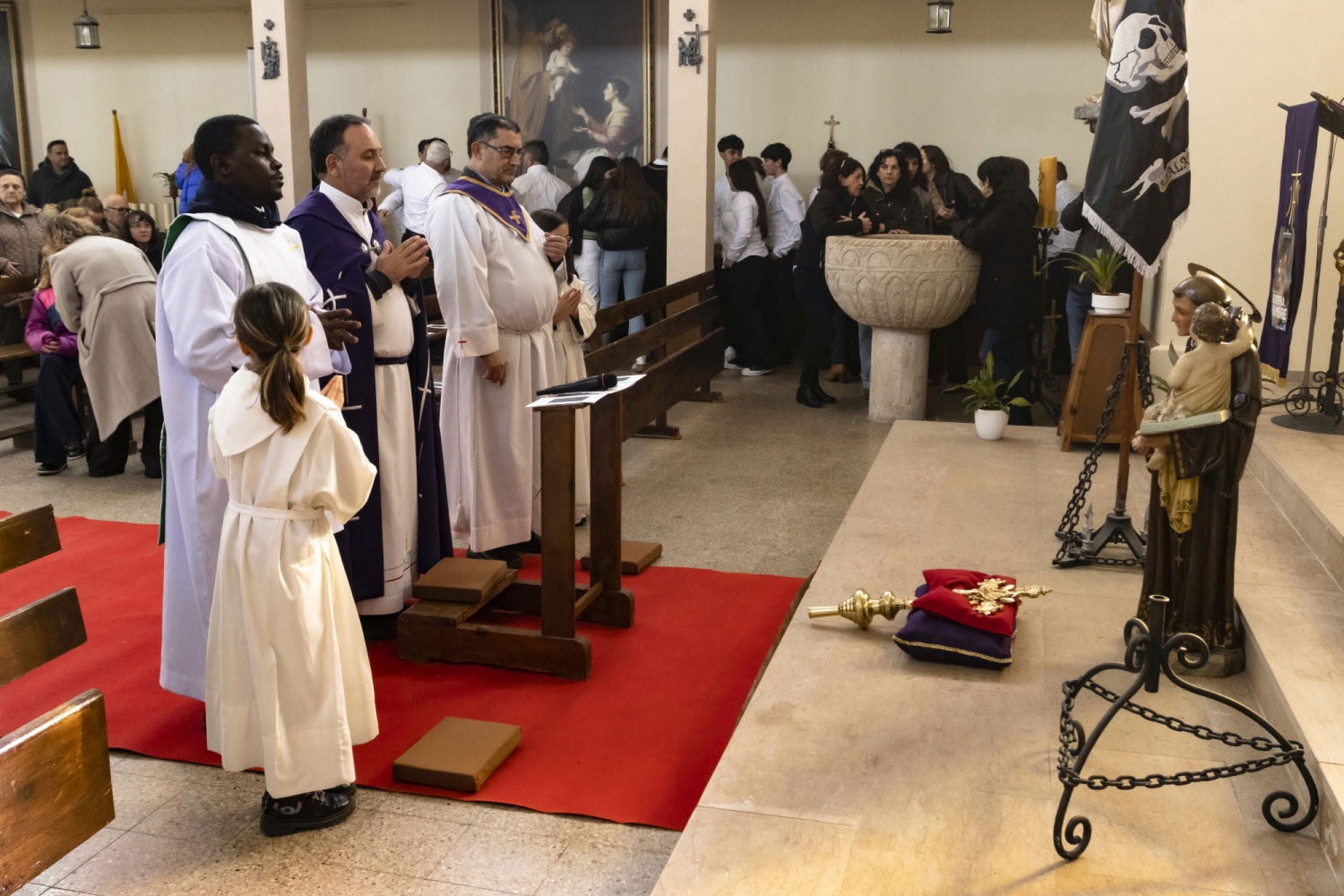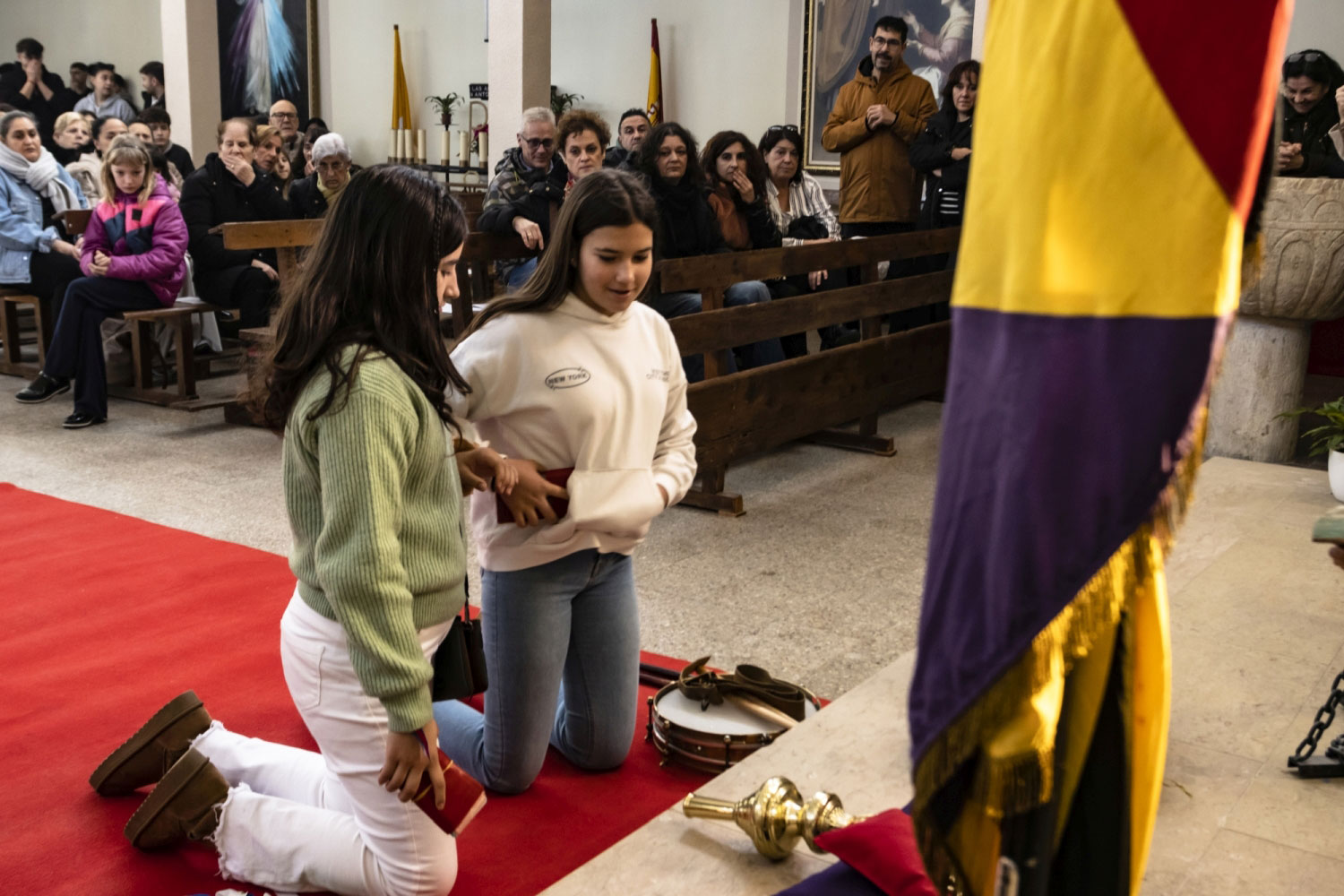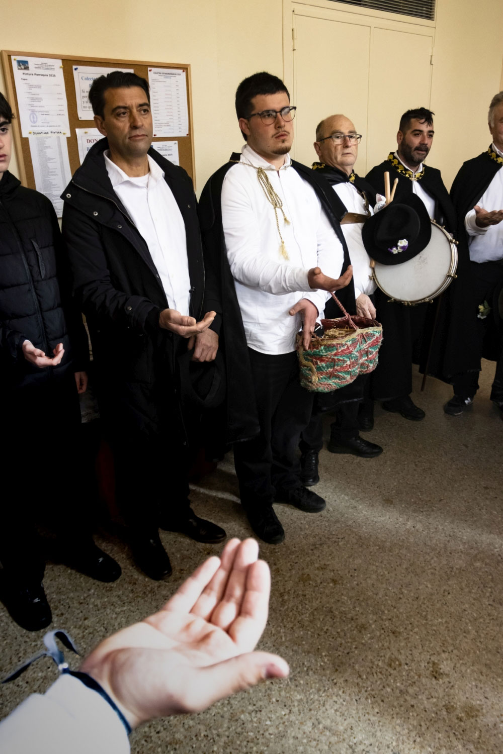 En silencio, cogidos de las manos por parejas, uno de cada grupo, se van acercando delante del altar con tres genuflexiones. Allí, besan la Cruz, dejan sus distintivos y ponen en las ‘vacías’ monedas de limosna para las Animas. Y Vuelven a su sitio entre tres nuevos arrodillamientos, de frente al altar.