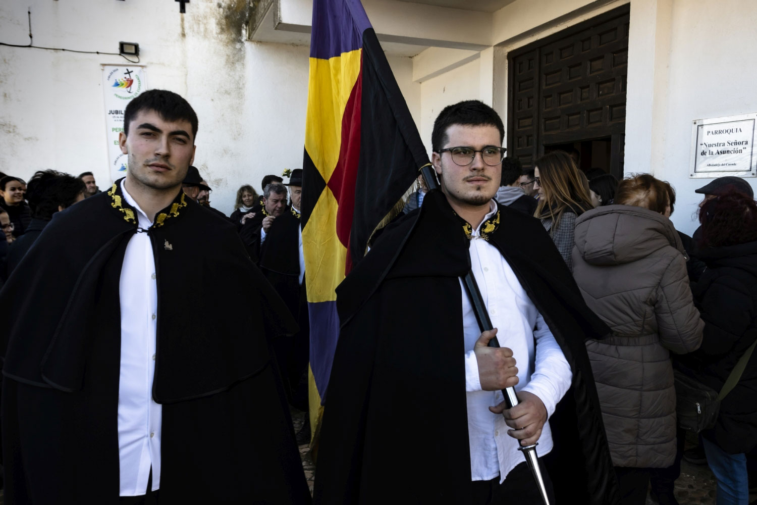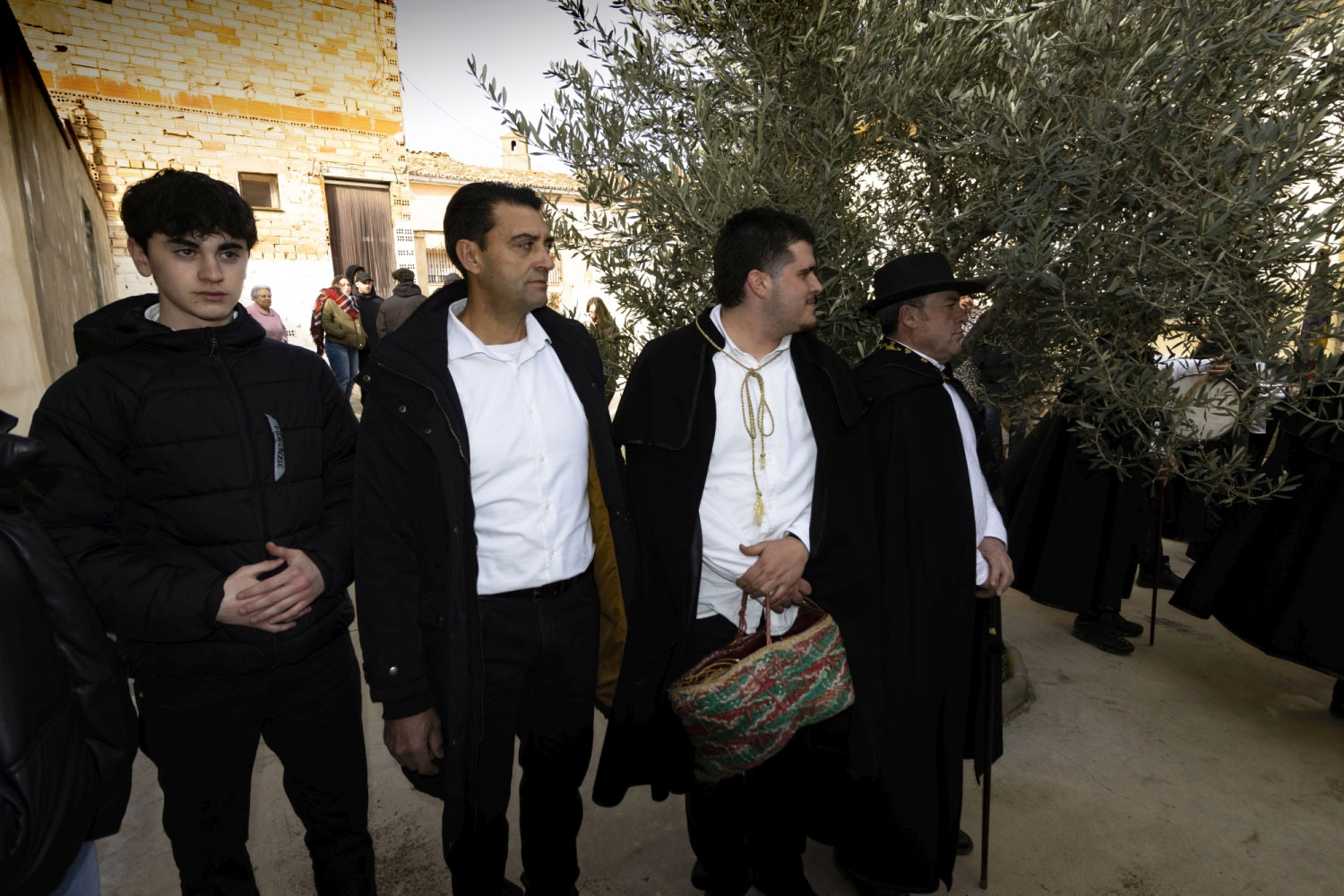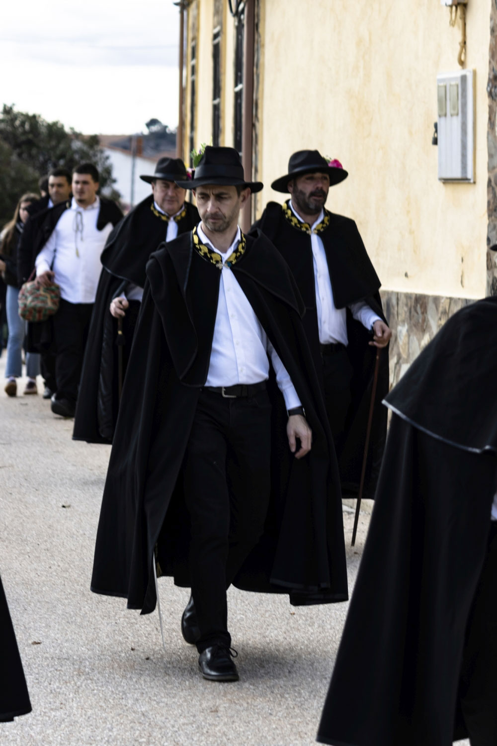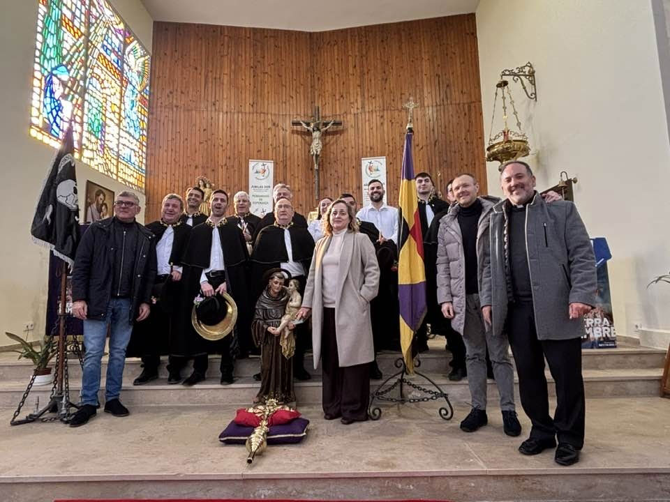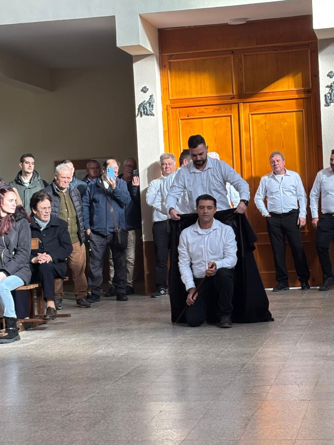 En silencio, cogidos de las manos por parejas, uno de cada grupo, se van acercando delante del altar con tres genuflexiones. Allí, besan la Cruz, dejan sus distintivos y ponen en las ‘vacías’ monedas de limosna para las Animas. Y Vuelven a su sitio entre tres nuevos arrodillamientos, de frente al altar.