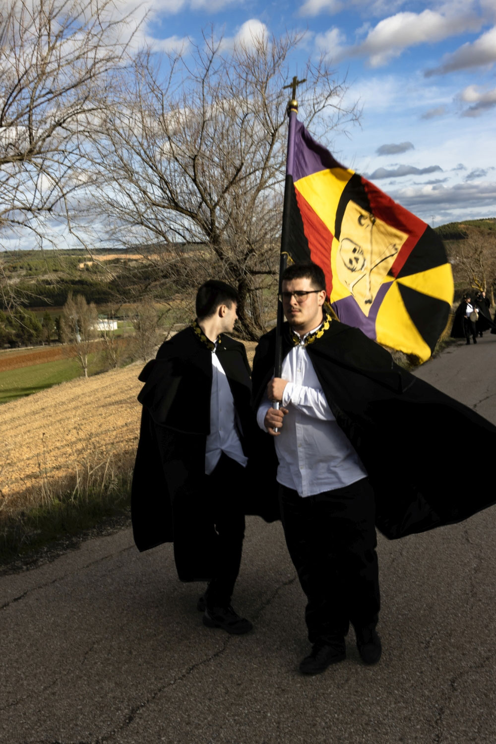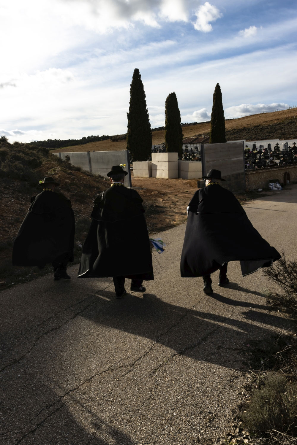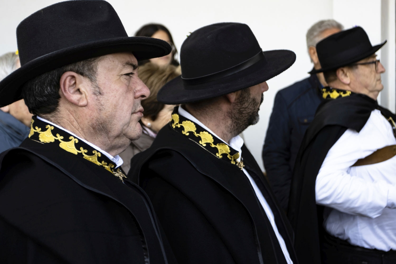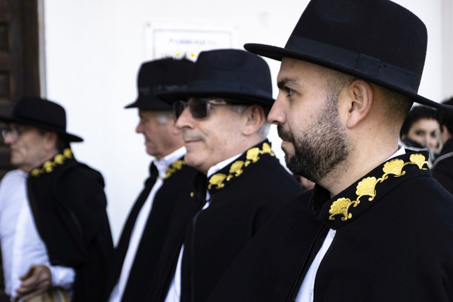 En silencio, cogidos de las manos por parejas, uno de cada grupo, se van acercando delante del altar con tres genuflexiones. Allí, besan la Cruz, dejan sus distintivos y ponen en las ‘vacías’ monedas de limosna para las Animas. Y Vuelven a su sitio entre tres nuevos arrodillamientos, de frente al altar.