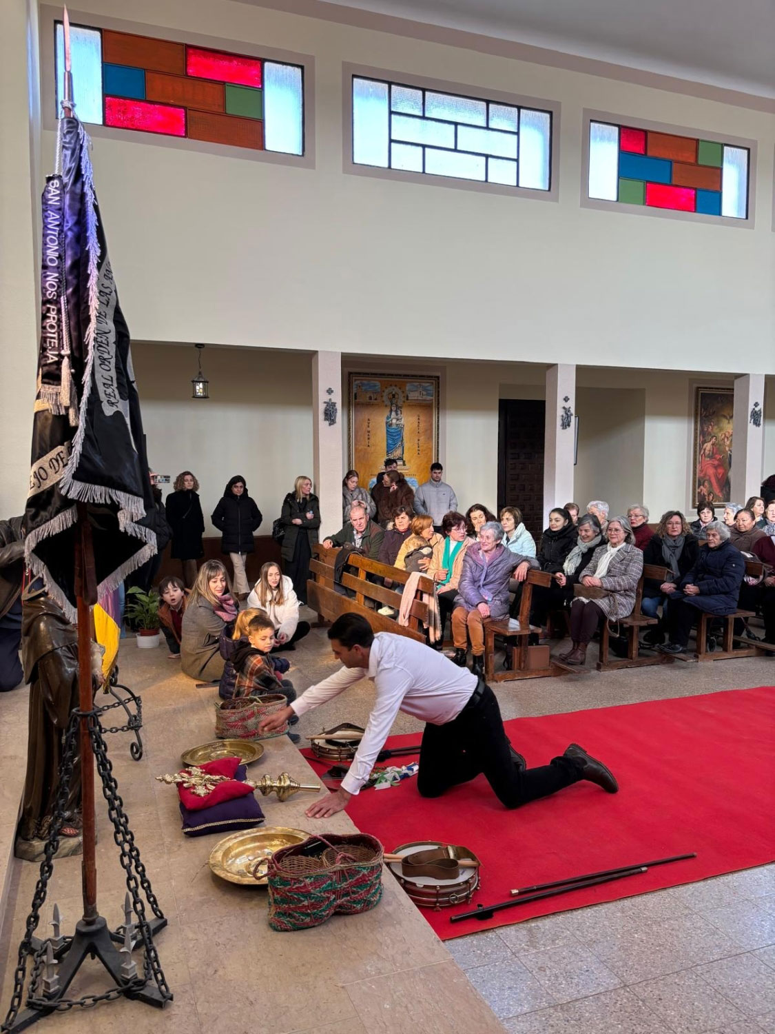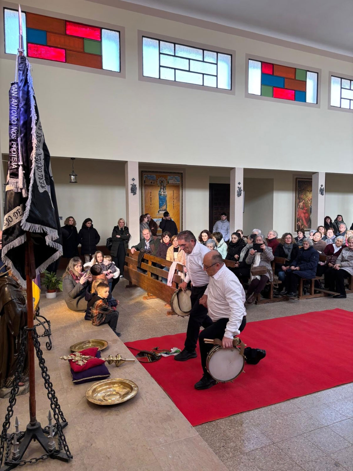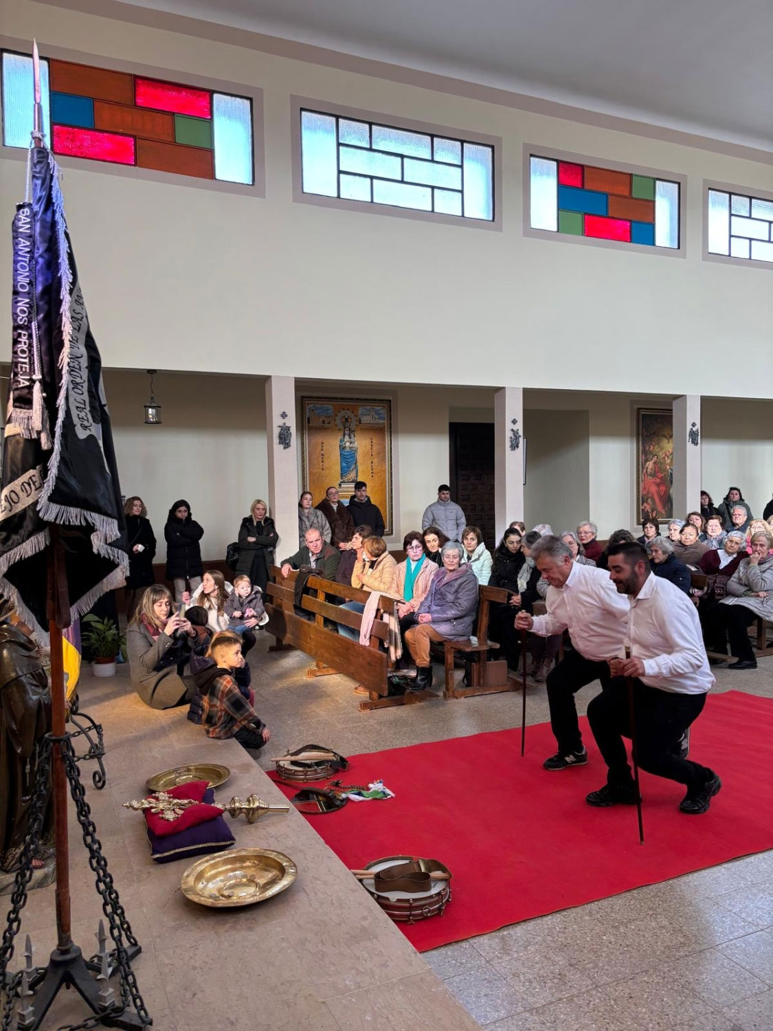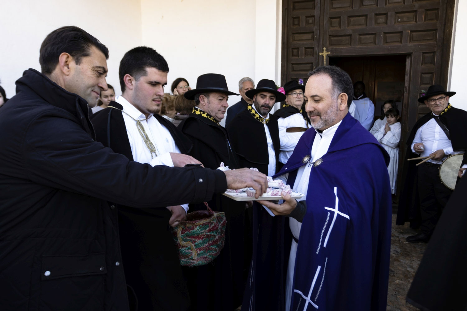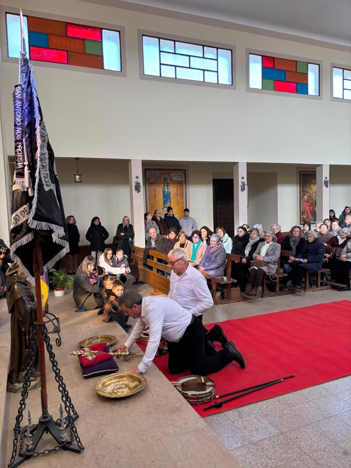 Tras dos días de festejos, el domingo a las puertas de la iglesia espera todo el pueblo. El acto, tiene gran interés, el sacerdote los recibe, y suenan las campanas, toca la ‘tercera’. Entran en la Iglesia, y delante del altar mayor esperan una cruz parroquial y la imagen de San Antonio.