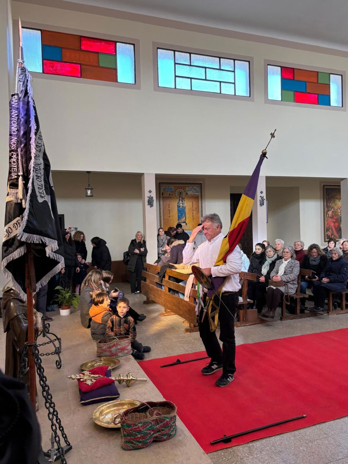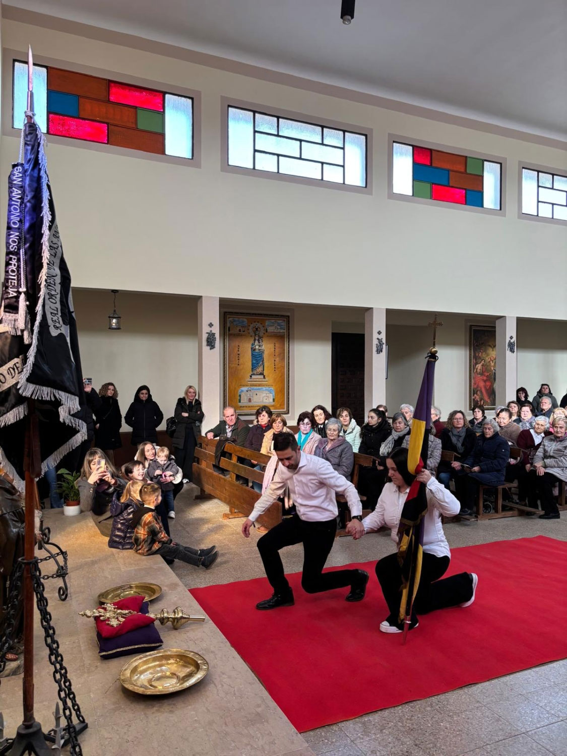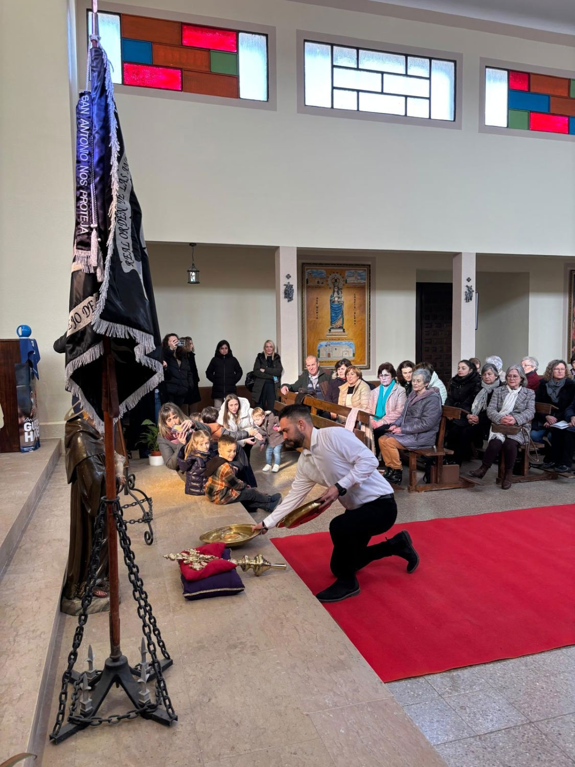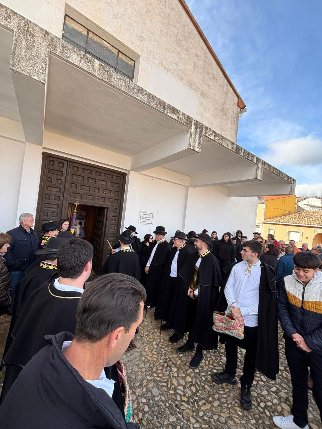 Tras dos días de festejos, el domingo a las puertas de la iglesia espera todo el pueblo. El acto, tiene gran interés, el sacerdote los recibe, y suenan las campanas, toca la ‘tercera’. Entran en la Iglesia, y delante del altar mayor esperan una cruz parroquial y la imagen de San Antonio.