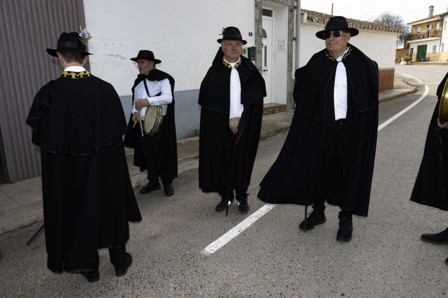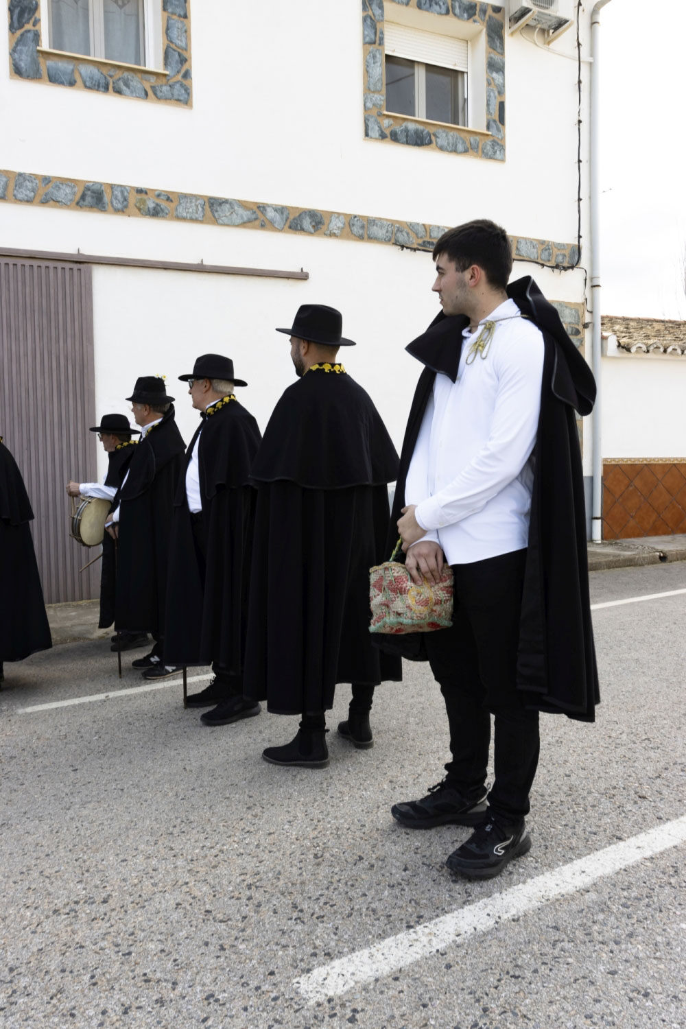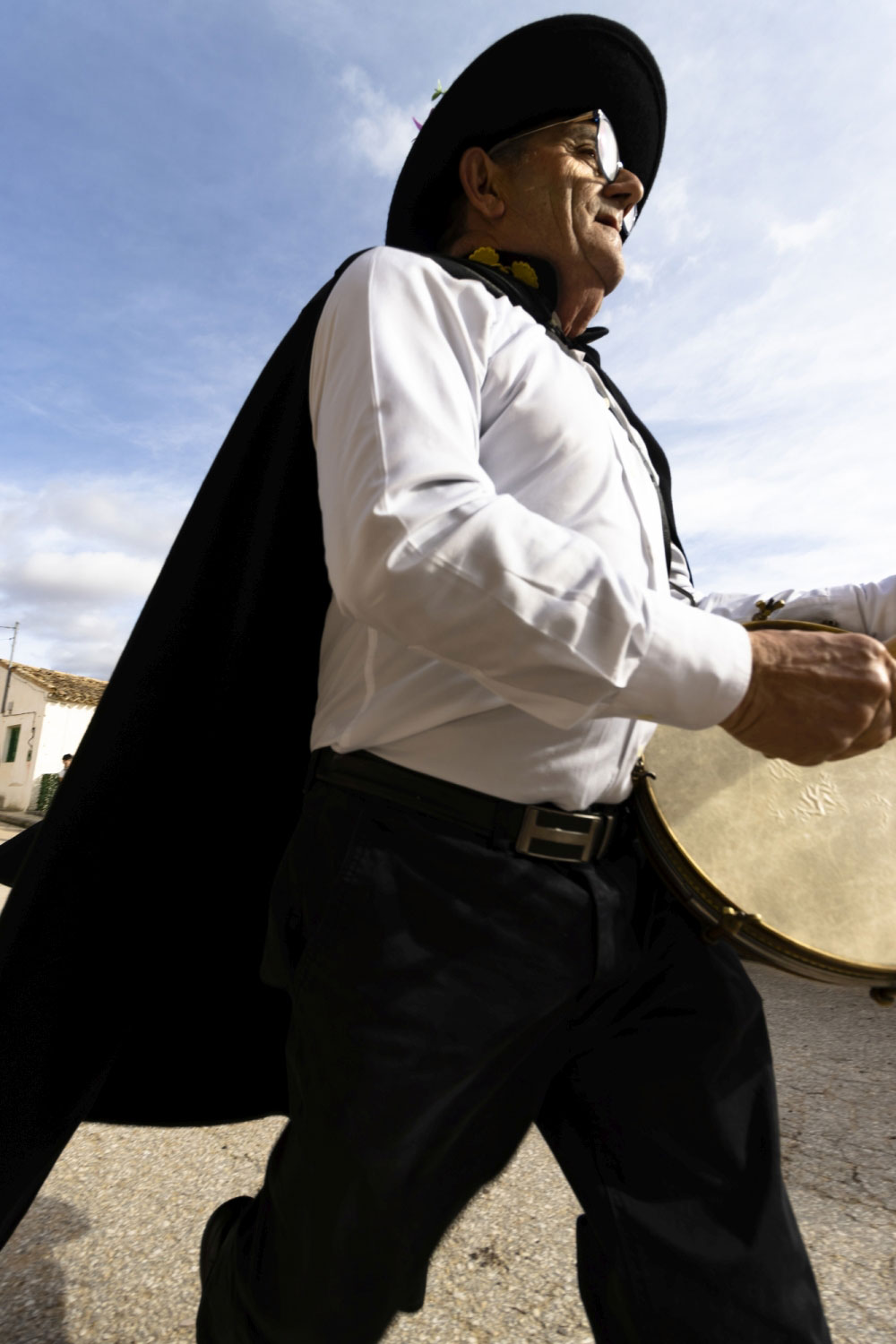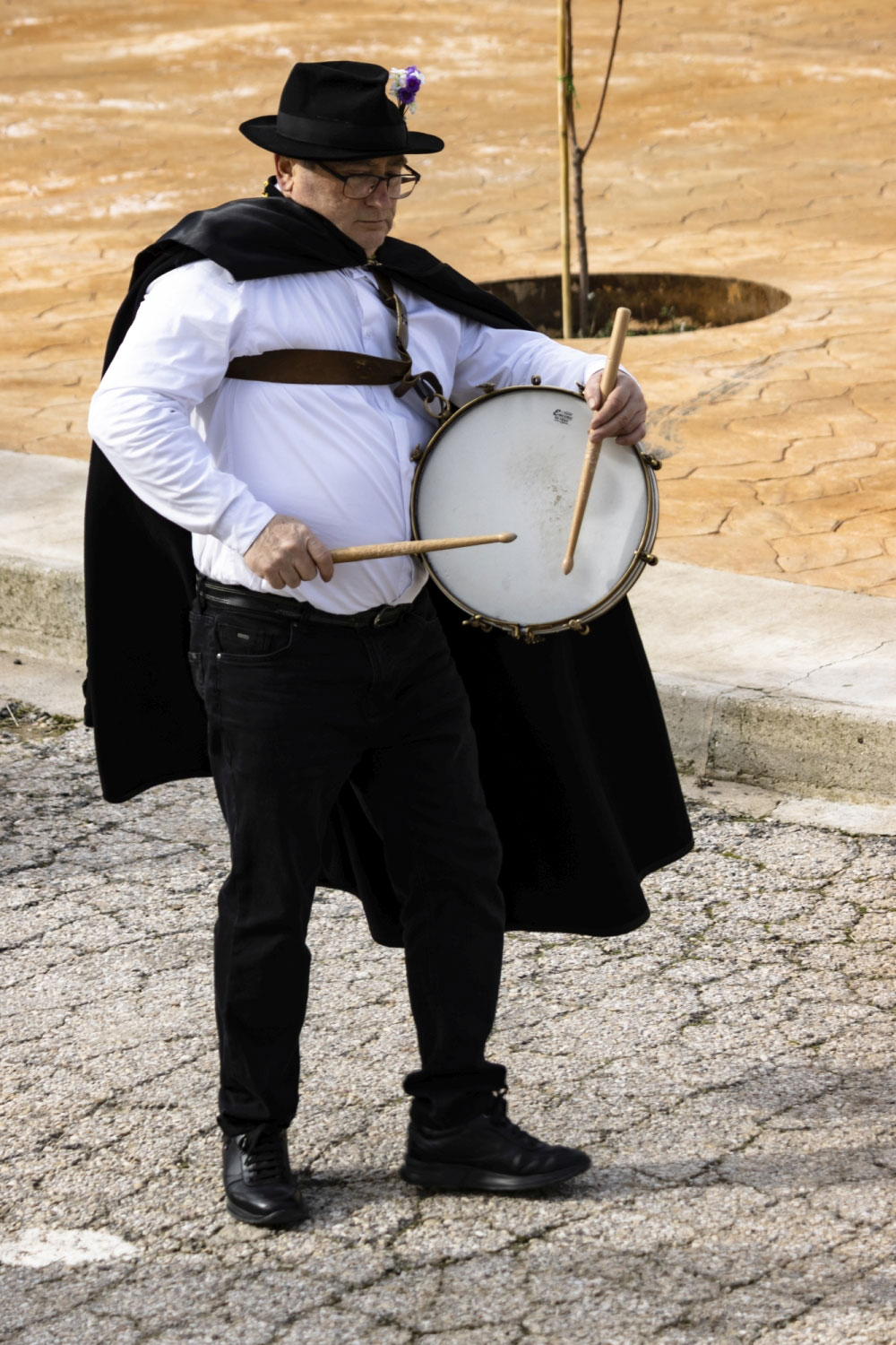 La vestimenta es una camisa blanca, un pantalón negro, una capa y sombrero con florecitas.