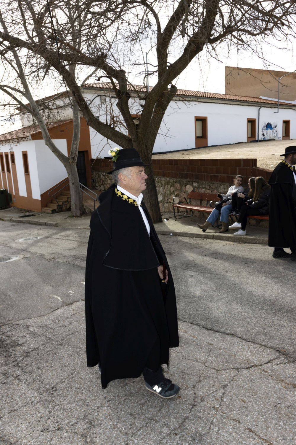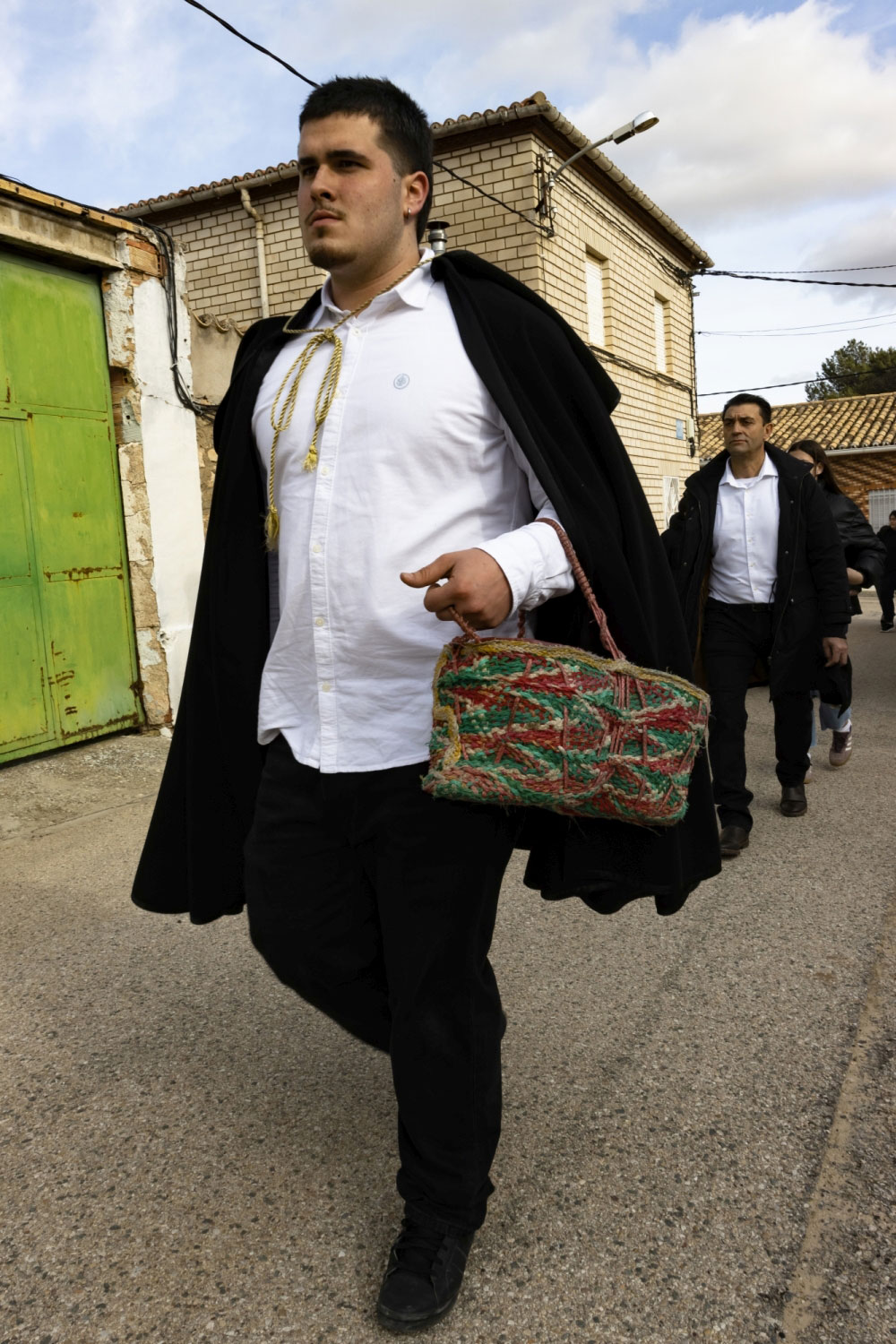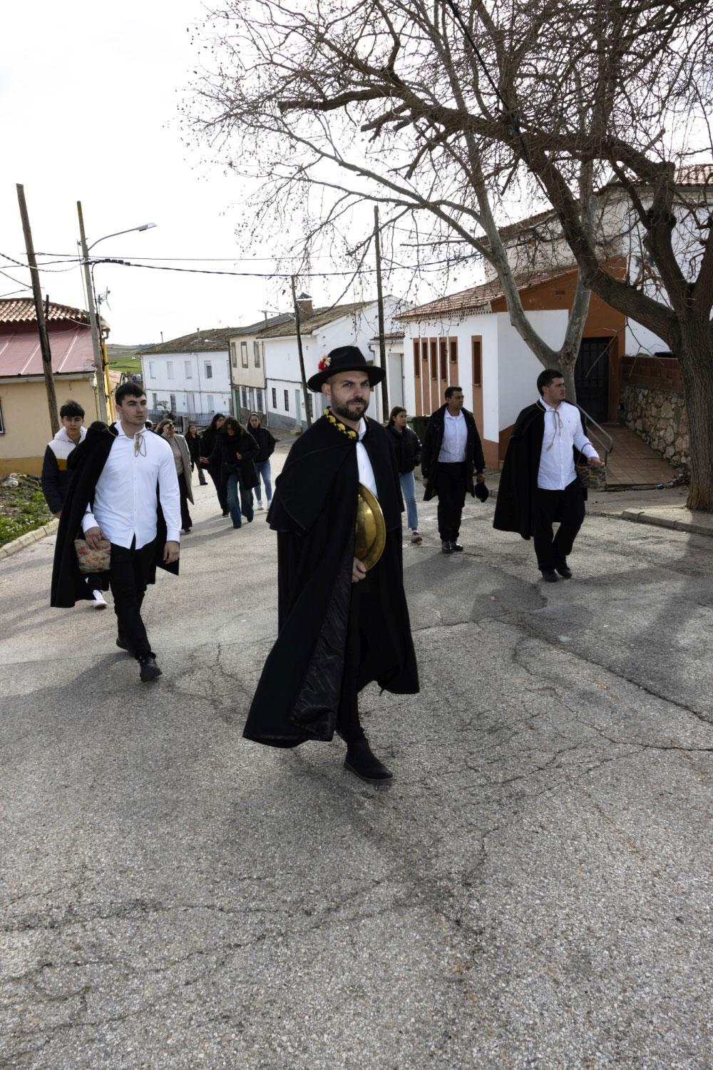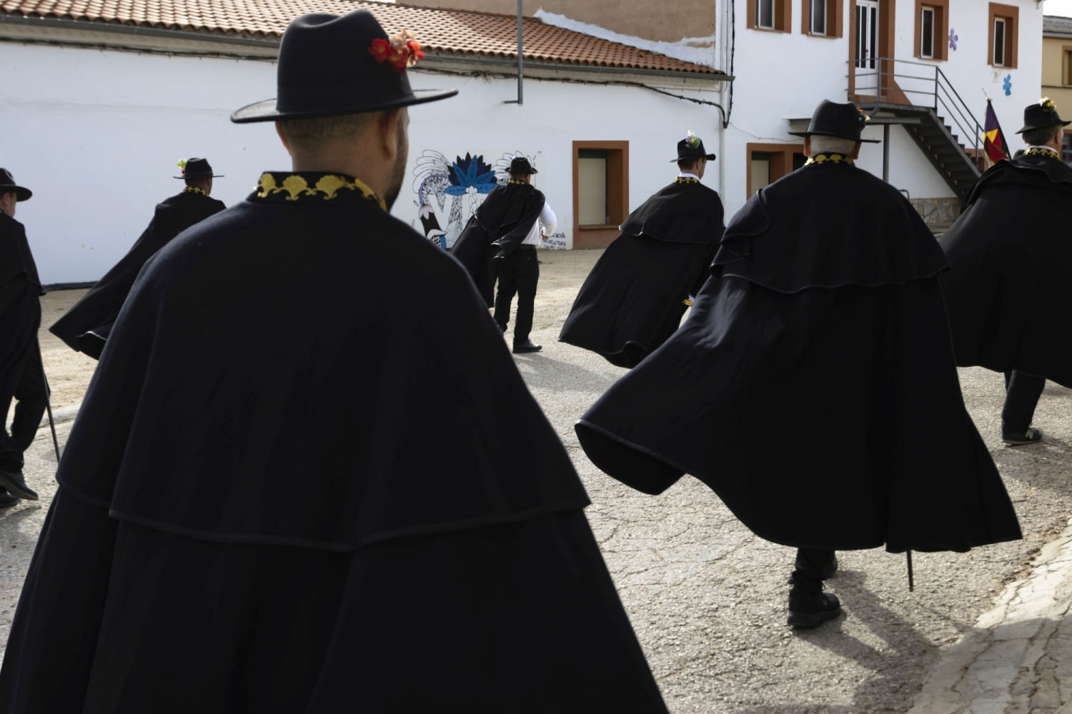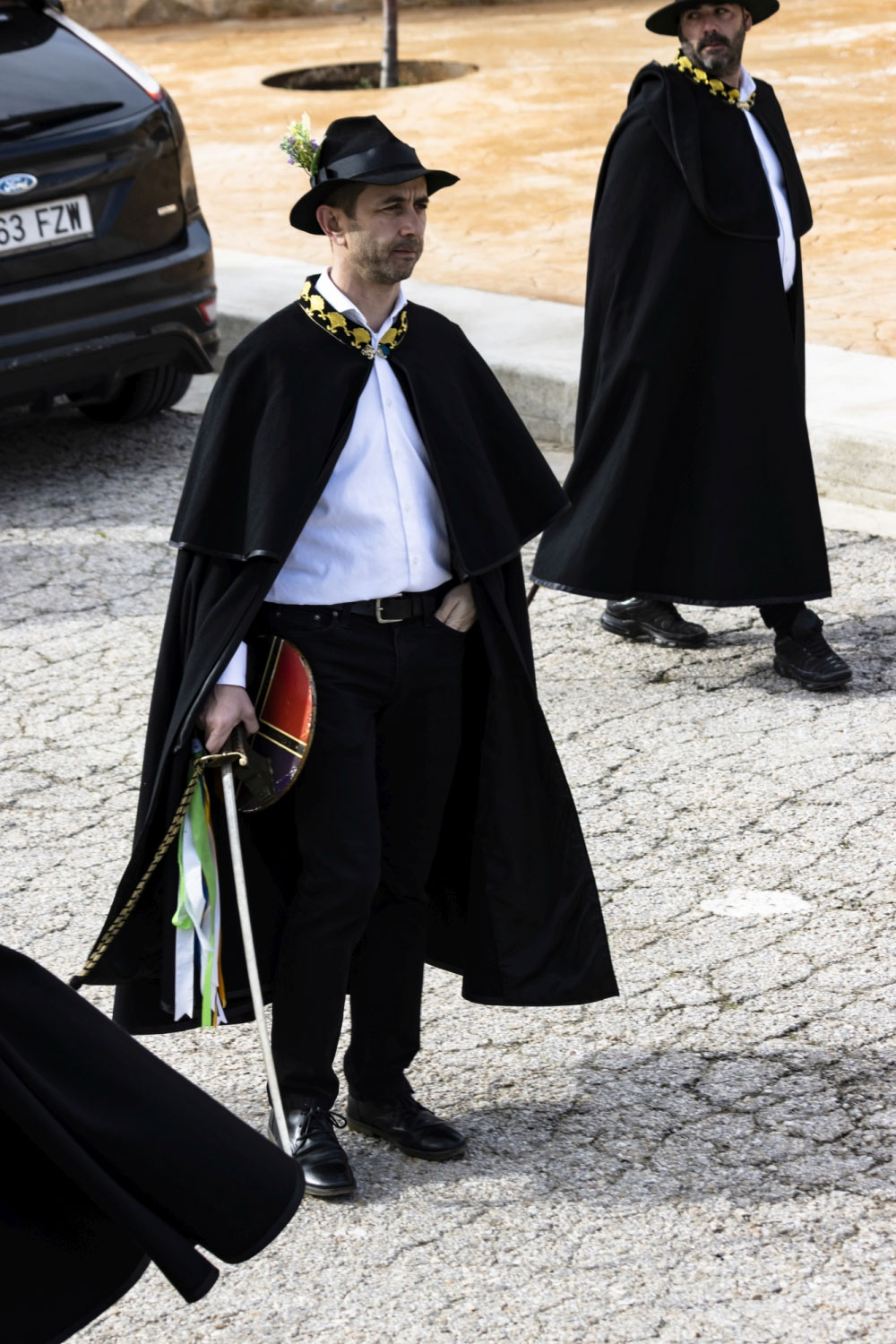La vestimenta es una camisa blanca, un pantalón negro, una capa y sombrero con florecitas.