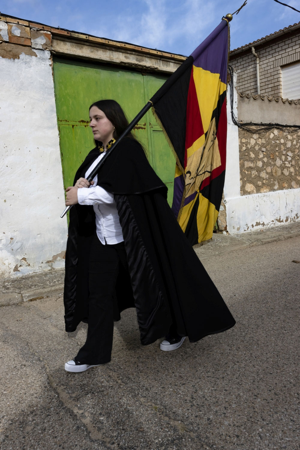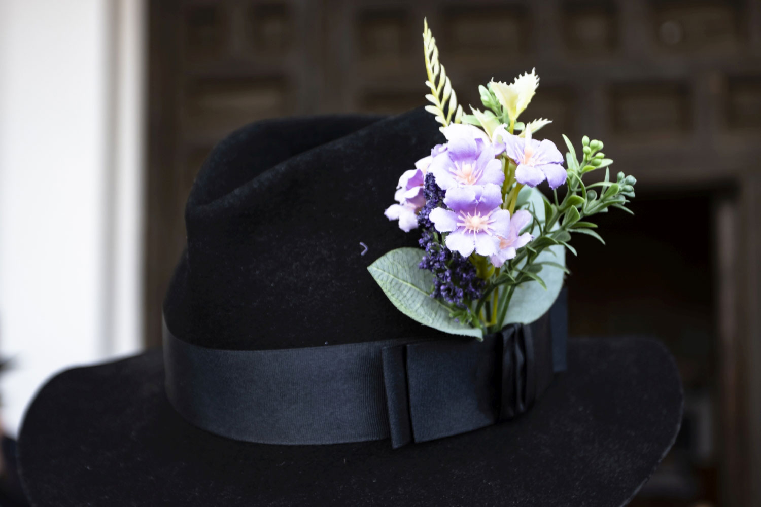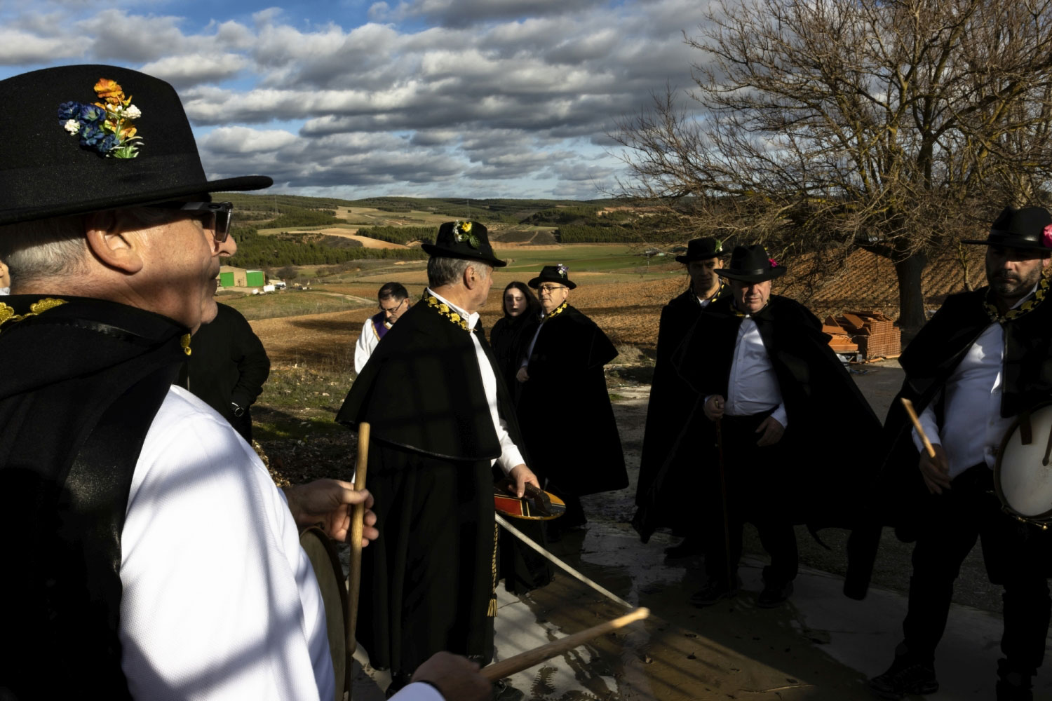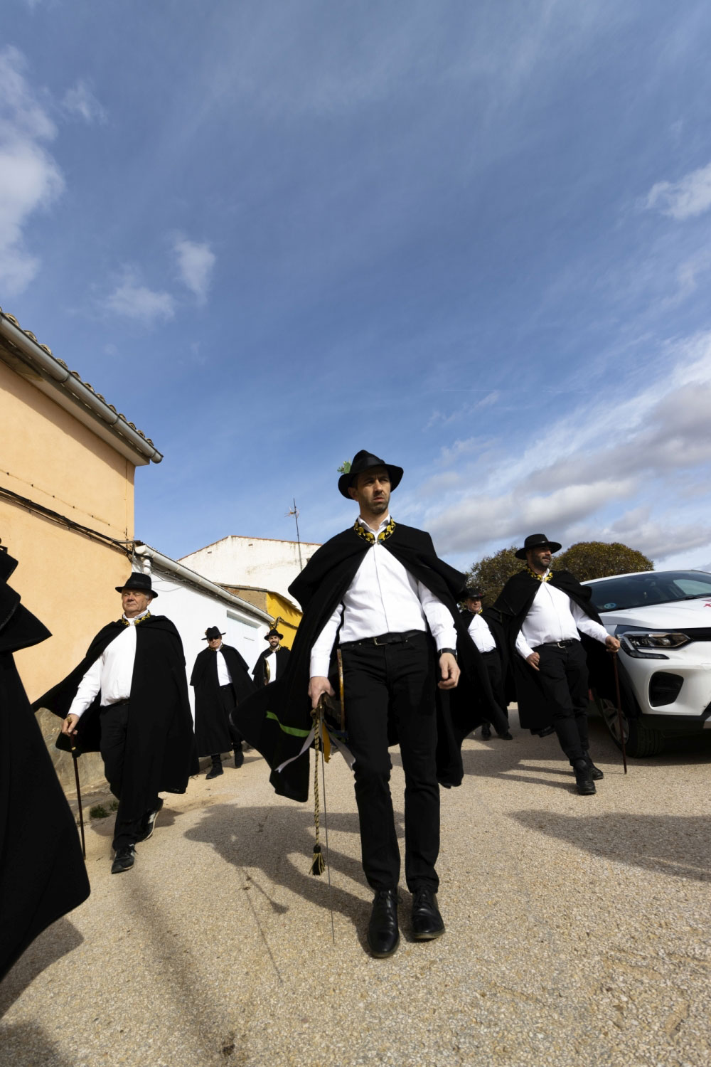 La vestimenta es una camisa blanca, un pantalón negro, una capa y sombrero con florecitas.